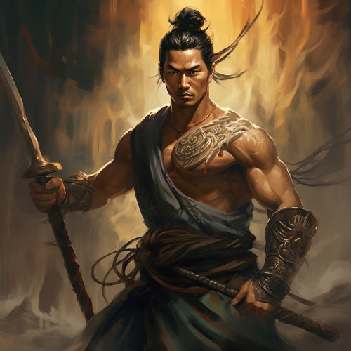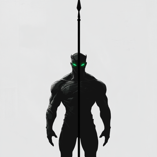 in the style of a minimalist movie poster. Empty white background, single black stipe running vertically down the center. Over the top of the black strip will be a man. The man will be mostly colorless except for glowing emerald green eyes. He should be a fit muscular man dressed in sleek leather armor. Have him holding a simple but fierce spear in one hand. He should look intimidating. Keep his size small enough that he only takes up the center third of the vertical space.