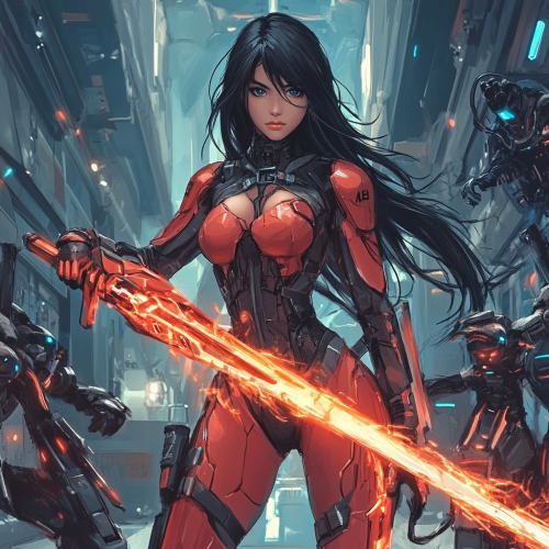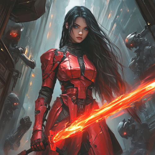 A beautiful, long-haired female warrior with black hair and blue eyes stands in red armor, wielding a sword that emits an orange-red glow, facing off fiercely against multiple mechanical enemies. The warrior holds a combat stance, looking straight ahead, with flames flickering along the blade, enhancing the sense of motion and the sword's power. The background is a sci-fi style spaceship or space station corridor, with various menacing robots scattered around, emphasizing the tension of the battle scene in a game setting, 3d model. --v 6.1