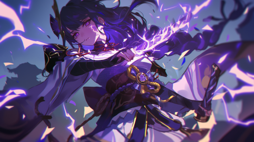 Raiden Shogun,Genshin Impact, female, intense illustration of Raiden Shogun from Genshin Impact, Raiden Shogun strikes a fierce and electrifying pose, with exaggerated muscles, sharp angles, and intense shading. Her traditional samurai-inspired attire is reinterpreted with bold fashion elements, including intricate armor details, flowing fabric, and powerful accessories. dynamic patterns, capturing the essence of her electro abilities, all in a vibrant and striking color palette. --niji 6 --ar 16:9