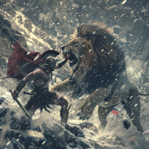 the most alpha male spartan warrior fighting a gigantic lion in a mountanous environment. it is snowing full HD