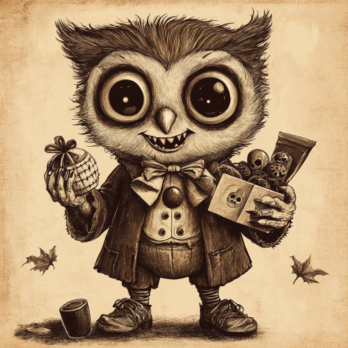 Cute and creepy owl character dressed as Frankenstein. Very cheerful, smiling, holding candy and chocolate. Halloween, sepia, Japanese 80s pop --v 6.1