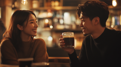 asian woman and man drinking some cup of coffee with smile, coffee shop lounge background, various angle , unreal gesture, super long shot, ultra realistic, --ar 16:9
