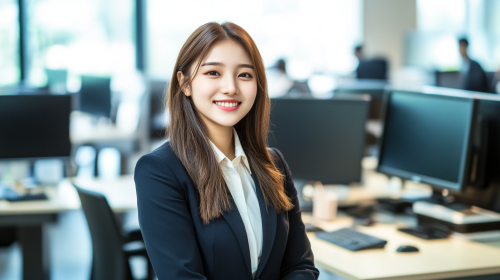 hd high contrast photo of a young beautiful smiling asian woman wearing a business suit in the modern light office, computers on desks at the background --no freckles --ar 16:9