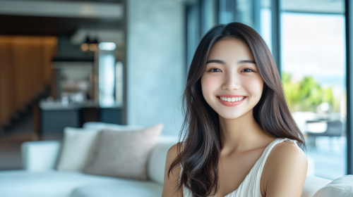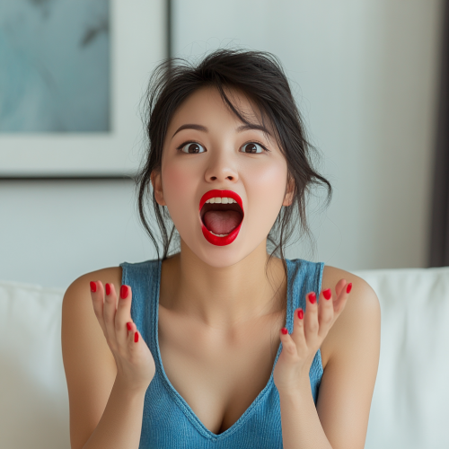 high definition ultra quality high contrast photo of a young beautiful asian woman with bright red lipstick and nail polish with her mouth open wide on a white couch in a modern living room