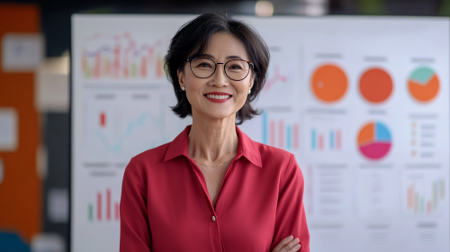 a middle aged businesswoman standing in front of a whiteboard, smirking, smiling, Asian woman, positive outlook, eureka, with charts and data behind her representing business assessment insights. Professional woman age 50, in a business setting standing in front of a whiteboard, analyzing data with graphs. Wearing red and blue. Keywords: professional, insightful, business analysis. Camera: DSLR, Lens: 85mm. Post: Neutral, clean lines with high contrast. --ar 16:9 --v 6.1