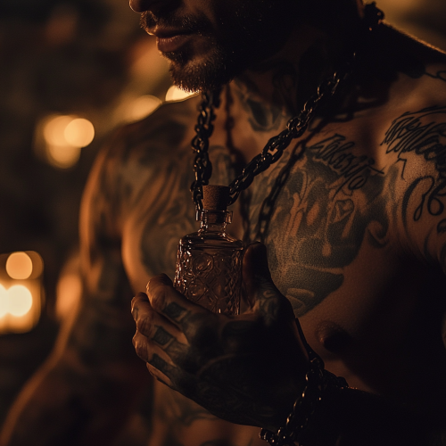 Close-up of a muscular tattooed arm holding a small one ounce bottle in a dimly lit, underground-style Thanksgiving setting, with metal chains and rugged textures adding an intense, rebellious mood.