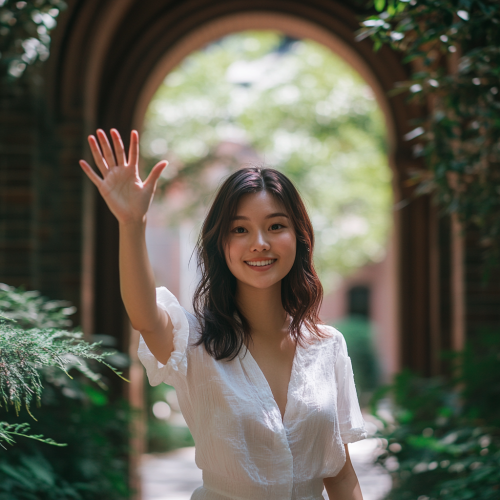 a portrait asian female student standing in a leafy university courtyard smiling whilst waving, she has 7 fingers on each hand instead of 5, sonya7iv, 50mm, --ar 1:1