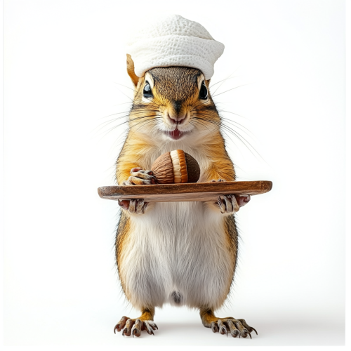 photo real image of a full body chipmunk, smiling, standing upright on hind legs, facing the viewer, holding a wood tray with an acorn on it, the chipmunk wears a white wimple headdress on its head, white background