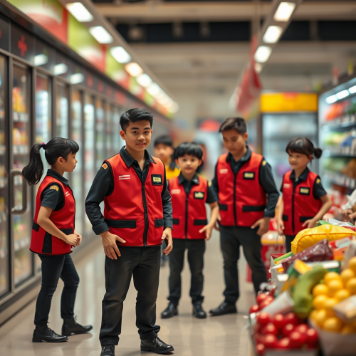 Three elegant Asian, professional young women standing together. They are dressed in the same formal long sleeves dress, understated uniform in natural tones, blending into a sophisticated, refined atmosphere. Each woman is smiling warmly, exuding grace and professionalism. and tasteful accessories. The background suggests a formal wall, ambient lighting, creating a welcoming atmosphere.