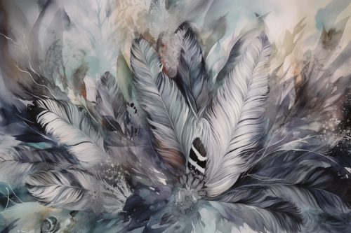 Abstract watercolour grey and silver ornate feathers, peacock, asian feel, plume, vibrant --ar 3:2 --v 5.0