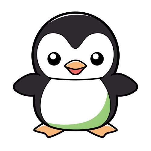 A cute cartoon avatar of a penguin with big eyes, smiling and waving at the camera in a green color. The background is white, with no Chinese characters next to it. It has thick lines, a black outline style, flat colors, simple details, no shadows, and clear edges for a cute appearance. This is a sticker design. There is white space above the character's head. --niji 5