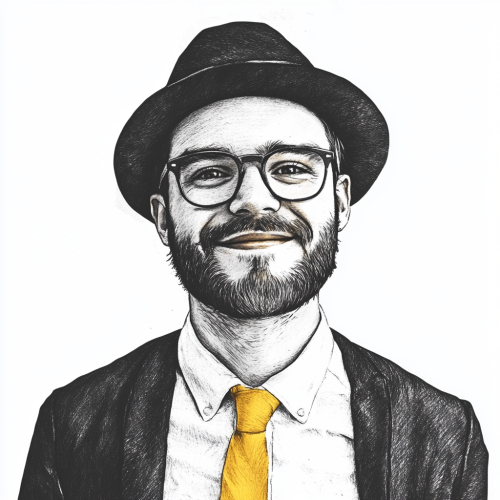 Handsome 20-year-old guy with a white button-down shirt with a yellow tie and a black jacket wearing a black hat with glasses shaved beard smiling pencil illustration style and coloring in chalkboard colors white background wedding photo style