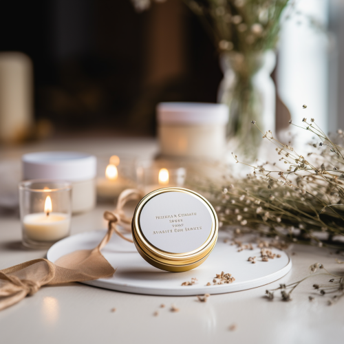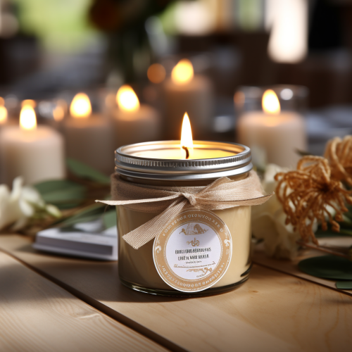 candle bonbonniere with round sticker seal against rustic table backdrop for wedding,daylight, e-commerce shop