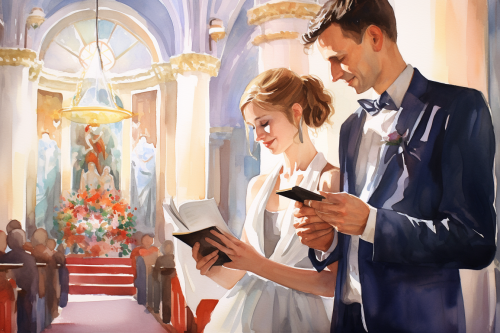 comic watercolours, Wedding ceremony in the church, view over the priest's shoulder, a festively dressed wedding couple, both holding a smartphone, --v 5.2 --ar 3:2