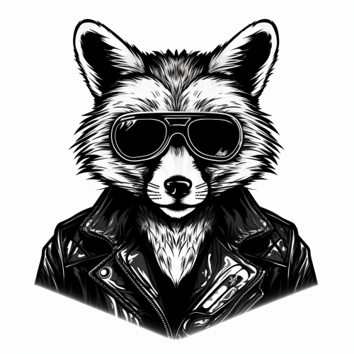 a fox dressed biker from a motorcycle gang,sunglasses ,sticker, vintage, old school,vector,black and white