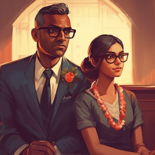 lawyer girl weds a gamer guy, indian ethinicity, in the style of a Grand Theft Auto, loading screen, GTA style artwork, flat art style, comic book style, painterly, couple, girl with braid hairstyle, sunglasses --v 5.0 --s 750