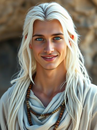 a young human male in his early twenties, Youthful features, smiling, balanced appearance. He is tall and slender, with long length platinum blonde hair. His eyes are large, elongated, and piercing blue as if they hold the wisdom of the universe within them. His forehead is high. His skin is luminous, almost as if it's glowing with luminous light from within. He has a strong, pronounced jaw, but displays a warm smile. He is wearing tunics and shawls in creams and ethereal whites which reflect his calm and peaceful nature. He has a tribal feeling to him.
