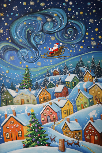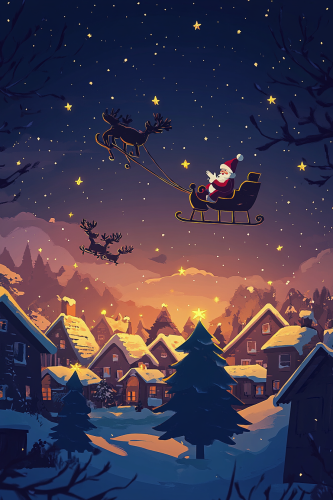 a fun cartoon style image, reindeers flying through the sky they are pulling santa's sleigh in the sky, santa is seated waving in the sleigh, which is in the distance, the night starry sky is sparkling and beautiful, underneath there are a village of cute houses with chimneys, christmas trees, snow, and presents --ar 2:3