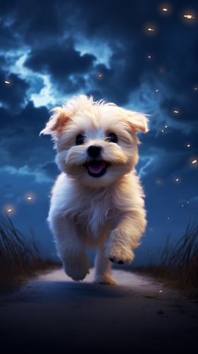 a cute little dog, running in the night shining sky. Hyperrealistic image, Artful, miniature ecosystem, vibrant colors. Display, light-hearted, natural lighting, cute --v 5.2 --style raw --ar 9:16