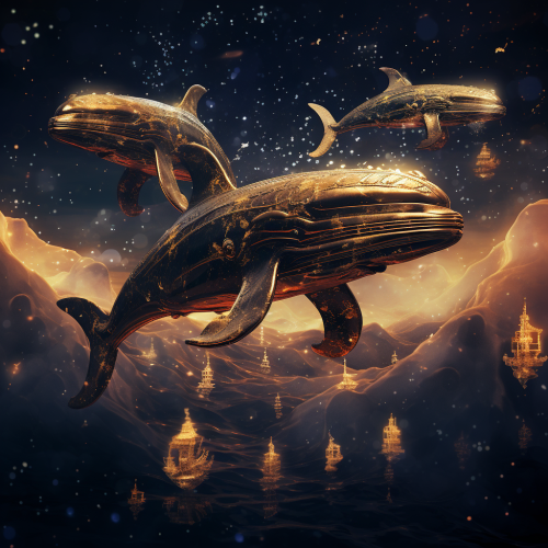 3 whales flying around night sky, stars and planets filled sky, digital art behance, golden sunset, baroque art style