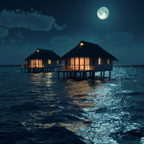 ultra realistic Maldives room huts in the sea at night time with moonlight glistening on the water