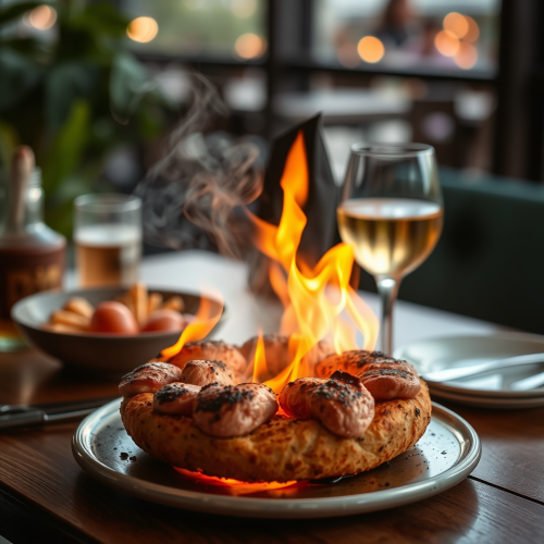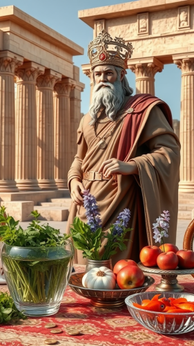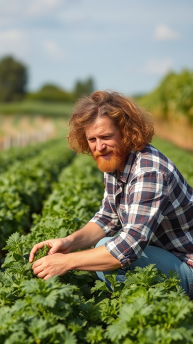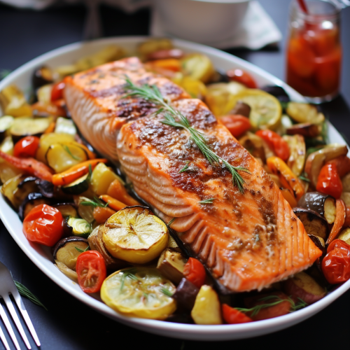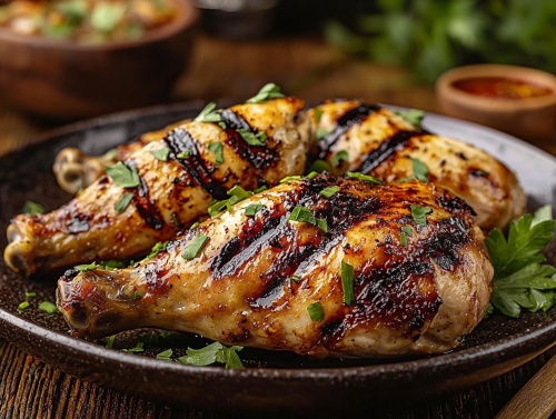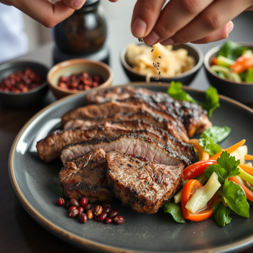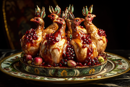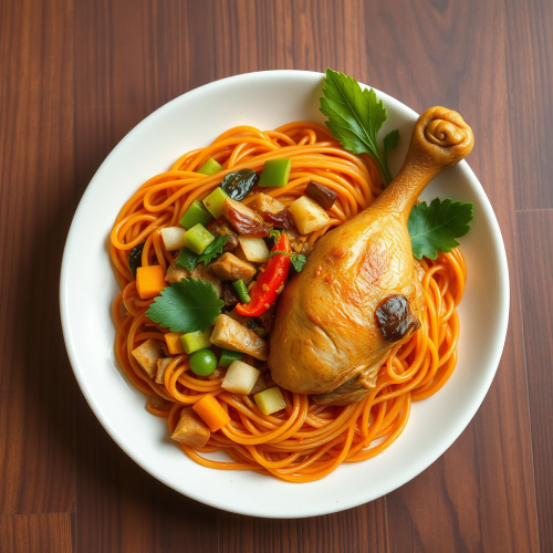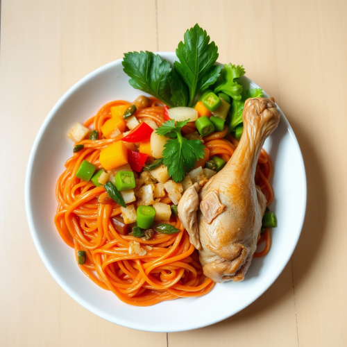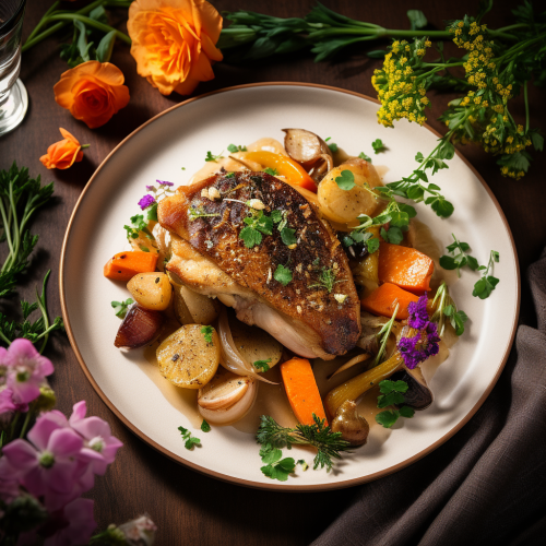 A beautifully plated dish of braised chicken with achillea and root vegetables, featuring succulent chicken thighs, and a vibrant array of carrots, parsnips, and celeriac artistically arranged in a savory sauce, garnished with delicate achillea flowers and herbs on an elegant plate with rustic, chic table setting.