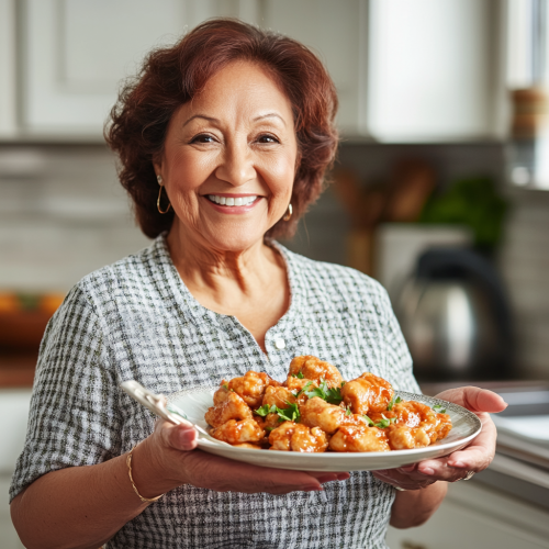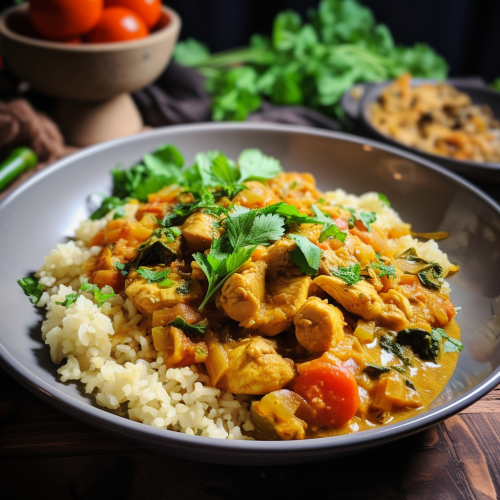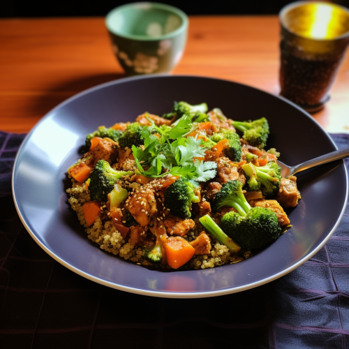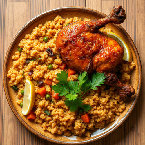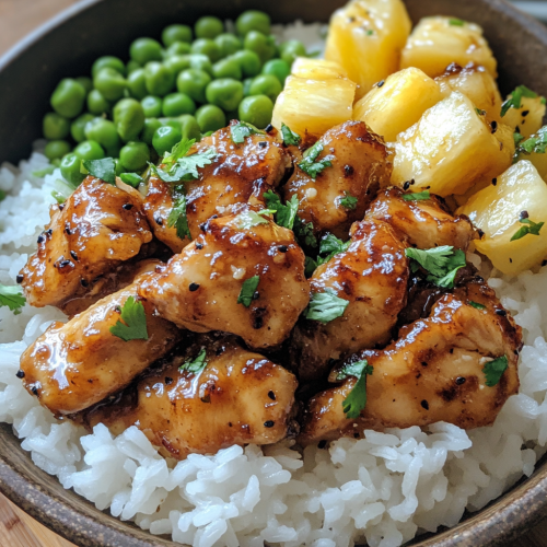 This Pineapple Chicken and Rice dish features tender, glazed chicken pieces atop a bed of fluffy white rice. The chicken is coated in a rich, savory-sweet sauce, likely made with soy sauce, garlic, and a hint of sweetness, giving it a caramelized finish. Scattered on top are small bits of chopped herbs, such as cilantro, adding freshness. Accompanying the chicken are vibrant chunks of juicy pineapple, providing a sweet contrast to the savory chicken. The dish is garnished with a few green peas and possibly mild chili slices, balancing the flavors and textures in this tropical-inspired meal,photo takeb by 15 pro,--ar 1:1