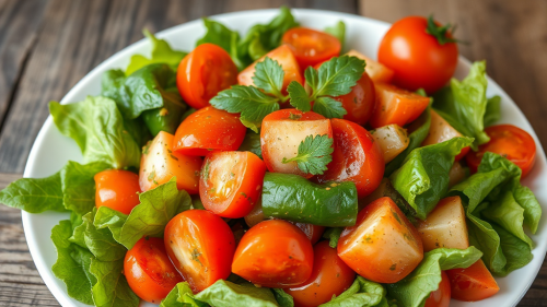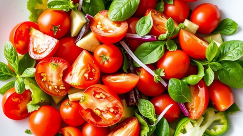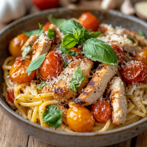 "Close-up of a vibrant Bruschetta Chicken Pasta dish featuring spaghetti tossed with juicy, roasted cherry tomatoes, grilled chicken chunks, and fresh basil. The pasta is garnished with a sprinkle of grated parmesan and minced garlic, adding depth and flavor. The dish is served in a rustic bowl with a bright and appetizing arrangement. A small inset shows key ingredients, including garlic cloves, fresh basil leaves, cherry tomatoes, and uncooked pasta, laid out on a wooden surface for a homestyle feel. The lighting is warm and highlights the fresh, colorful ingredients