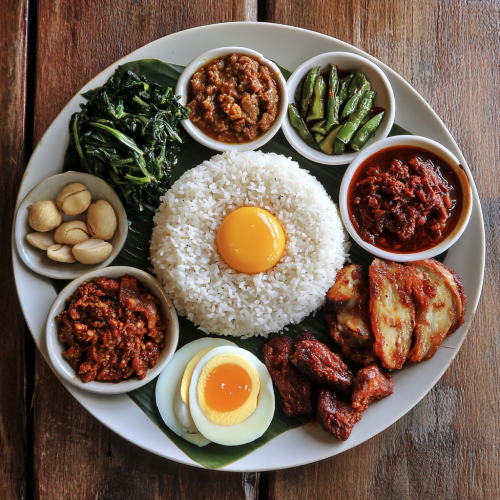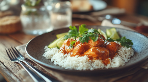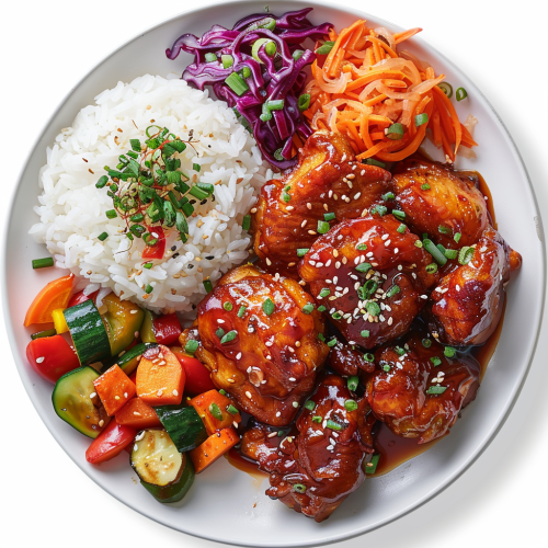 product photography full shot of Korean dish, very delicious looking korean braised spicy chicken, a scoop of rice, rosted vegetables, asian coleslaw all on th white retagular plate --s 250 --v 6.0