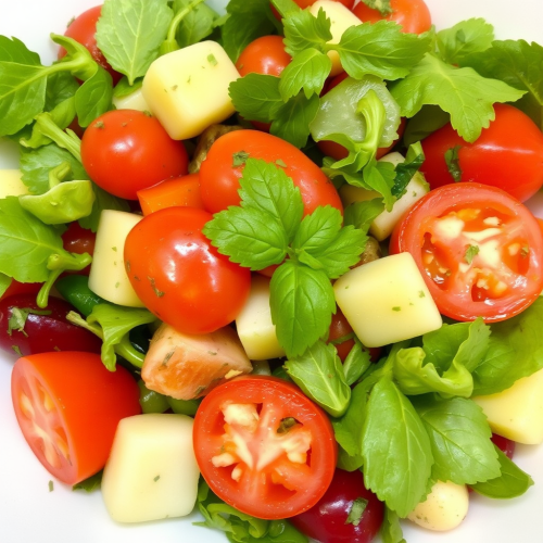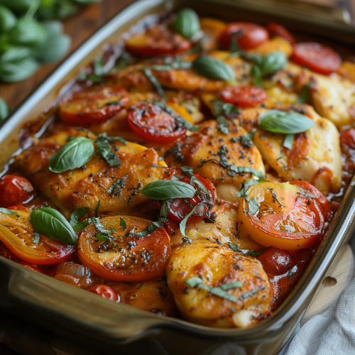 caprese chicken and polenta bake served in a rustic dish --ar 1:1 --v 6.0 --s 750 --style raw