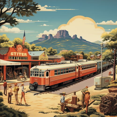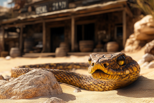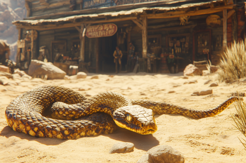 Realistic, evil, scary: [Cut to a medium shot of a rattle snake in the texas desert. Rocks and sand and a western saloon with cowboys are in the background.] yellows, golds, greys, unreal engine, hyper-real --v 6.1 --ar 3:2