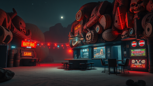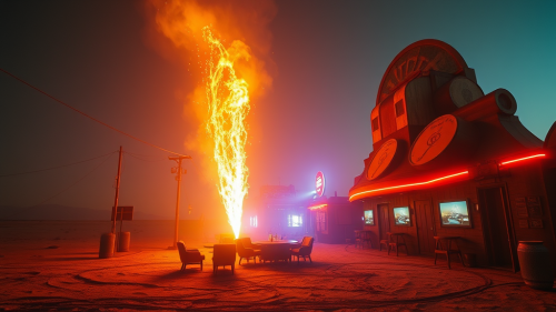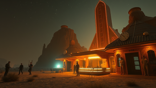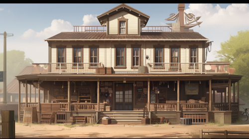 Realistic, evil, scary: [Cut to a medium shot of a rattlesnake in the texas desert. Rocks and sand and a western saloon with cowboys are in the background. The saloon has a spot for a sign but it is blank.] yellows, golds, greys, unreal engine, hyper-real --v 6.1 --ar 3:2