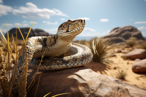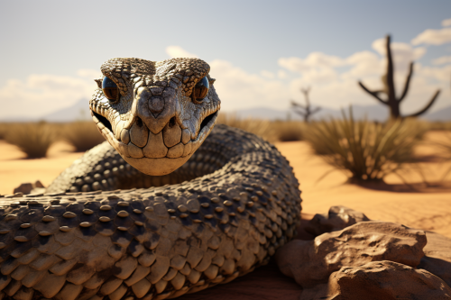 Realistic, personality: [Cut to a medium shot of a rattle snake in the texas desert. Rocks and sand and cactus are in the background.] yellows, golds, greys, unreal engine, hyper-real --v 5.2 --ar 3:2