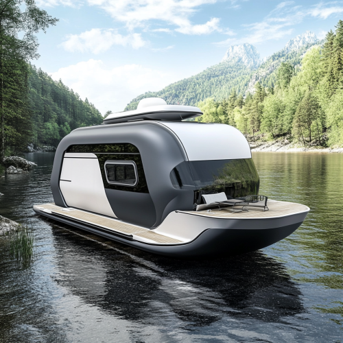very modern camper with intragrted boqt on the back black or white boat with mercedes sprinter front make a clear distincton between the bqin of the truc qnd the boqt behind