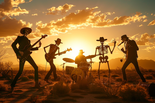 silhouette of 5 skeletons two of them playing two electric guitars and another one an electric bass and one of them playing a drum section and one of them holding a vintage microphone in the Texas desert backlit in a sunset whose sun is huge, in the style of a graffitti of Banksy --ar 3:2 --v 6.0