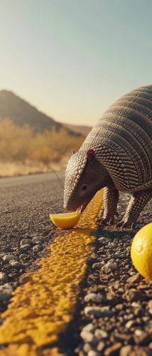 an armadillo licking a lemon on a highway, on the desert of Texas. 8k. --ar 3:7 --v 6.0