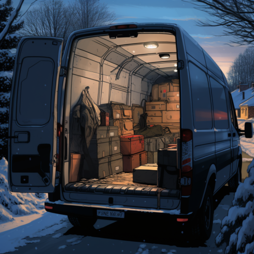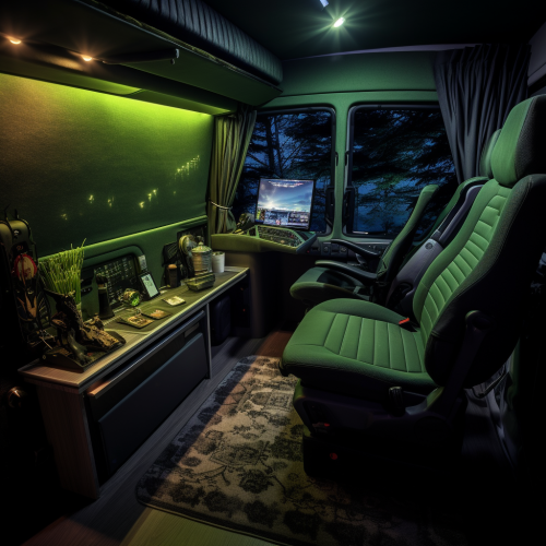 Realistic studio Photography. A close-up of a mat green Mercedes sprinter camper van. The dark interior of the camper van is a creative office. A desk with twho large screens and a office chair. POV outside the camper van looking in through the side door