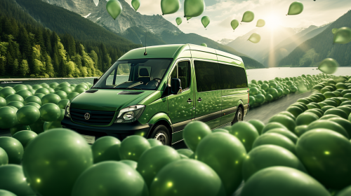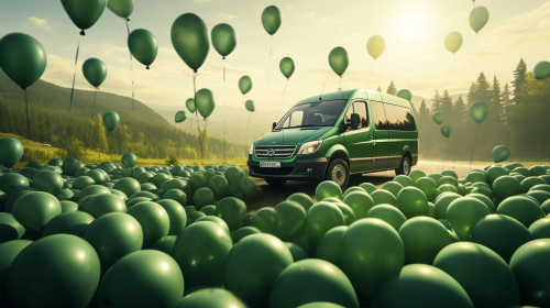 realistic photo of one modern green mercedes sprinter van driving through 1000 green balloons at sunrise, 35mm lens, canon 5R, depth of field, edgy design --ar 16:9 --s 250