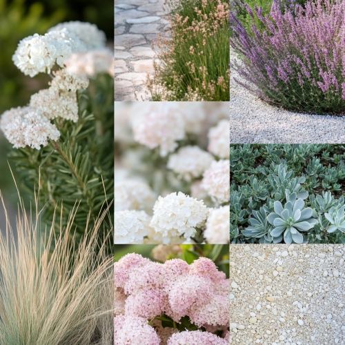 create a mood board in a 16:9 ratio for 11x17 printing of texas native plants providing emphsasis on different textures, soft colors, naive gravel, mexican beach pebbles. featuing miscanthus grass, pink muhly grass, white hydrangea, boxwood, rosemary, salvia, live oak, vitex, holly, agave, yucca
