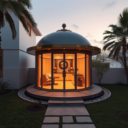 futuristic small monolithic abstract shaped house on a cliff overlooking the ocean,