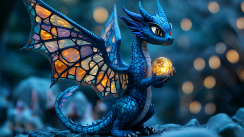 An etherial, beautiful, realistic, adult kawaii, tall, female navy blue dragon with wings made of stained glass, holding a gold globe of fire --v 6.1 --ar 16:9