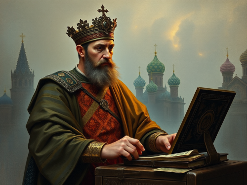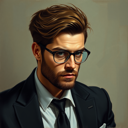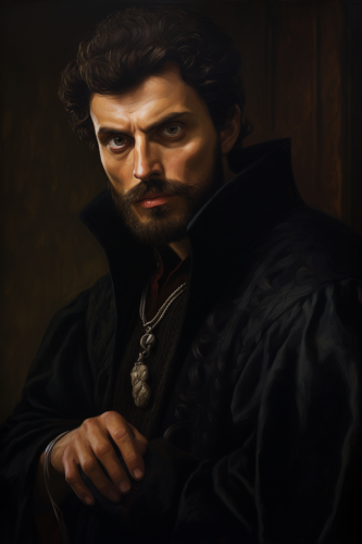 oil painting, painting style of Caravaggio, 15th century vampire, thick brown hair, deep blue eyes, masculine brown beard, he's very athletic, he's evil, debonair and wealthy, background is his vampire home, immense attention to detail, --ar 2:3