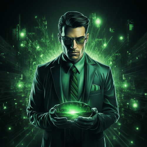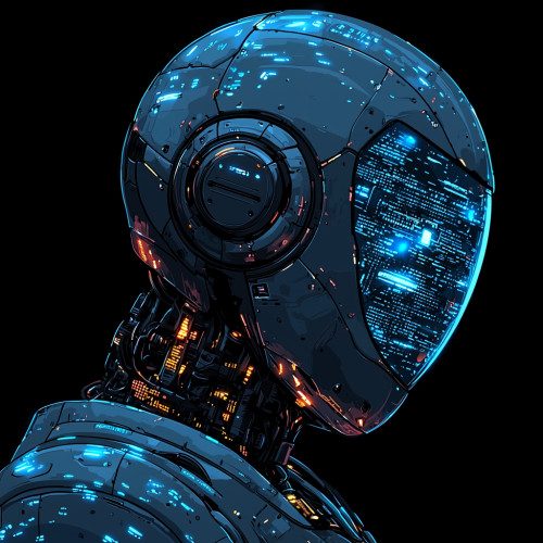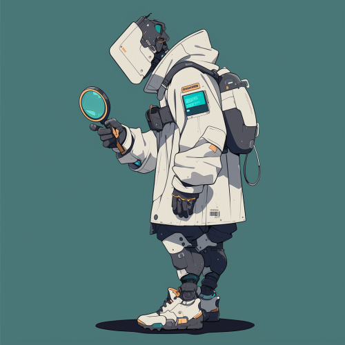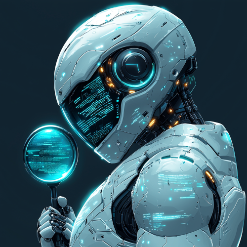 Minimalist, futuristic robot detective logo in vector style, focusing on clean, sleek lines with modern AI and intuition vibes. Incorporate subtle elements like a glowing magnifying glass, digital screens, or data streams to hint at advanced analysis. Use a cool color palette of blues, greens, and metallics, giving a tech-savvy, professional feel. Designed for a microsite web API product, the logo should be simple enough for stickers and branding. --v 5.2 --stylize 1000 --ar 1:1