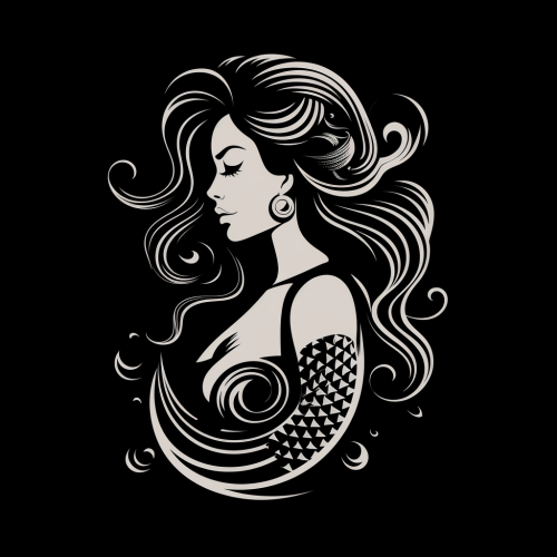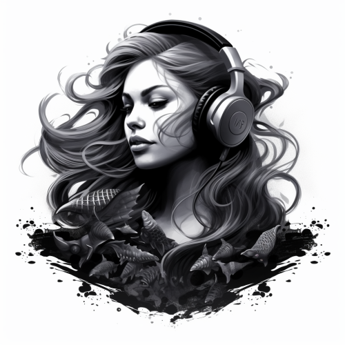 Make me a realistic black and white logo. The logo is an alternative mermaid character with masculine features and mixing electronic music. She has short hair