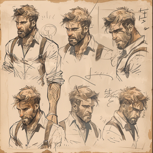 Character sketch illustration page with multiple poses, figure study, brown ink - of John Krasinski with a beard and messy hair, broad shoulders and muscular build, with a stoic expression that is almost angry, wearing leather suspenders a long sleeve shirt with the sleeves rolled up to expose his forearms, protective stance - 1920s themed, no colors