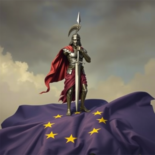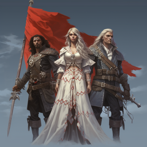 a ice Queen, a pirate and a Stone age man standing next to each other with a red Flag and white Stars.
