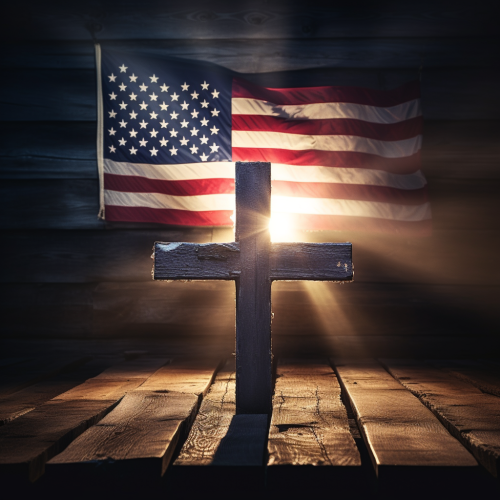 picture of a glowing cross sitting on a weathered old wooden table next to an American flag. DSLR. realistic lighting. — ar 34:9