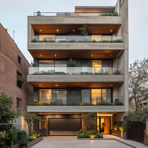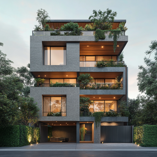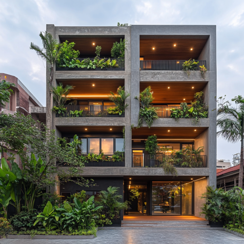 Front view of an 8 levels contemporary modern building. The building is 22 meters wide. On the ground floor, there are plants on the left side and an entrance on the right side. Each floor has 2 residential units, with 2 balconies extending from the facade on each level. The penthouse is on the top floor, featuring additional plants on the terrace. the height is 8 level building. not the 4 level.
