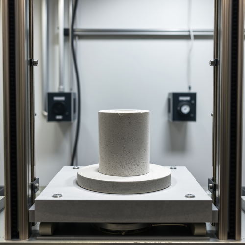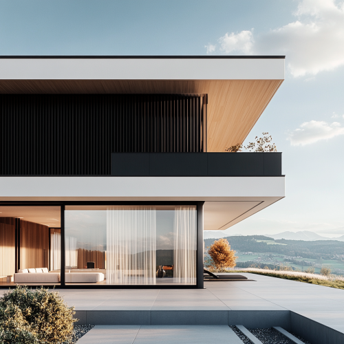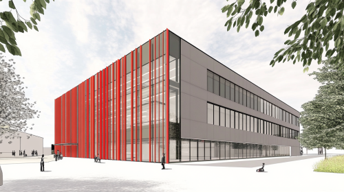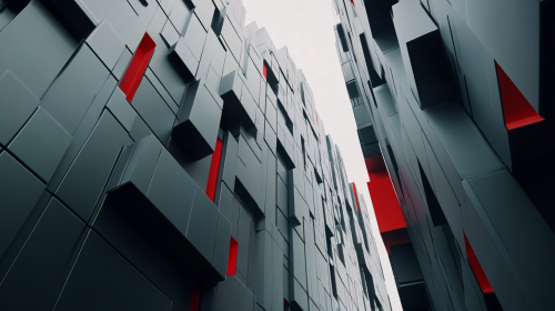 an perspective view of a realistic architectural rendering of a factory building in the form of a long and tall rectangular cube. the facade is vertical sandwich pannel that are two tones of gray and some red one as accent. --ar 16:9 --s 50 --style raw