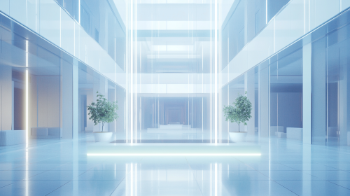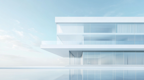 full exterior view of a 5 story building all white reflective and clear bottom with a high lobby. glossy reflective, all white reflective, center piece in the lobby bifurcates, dawn, realistic --ar 16:9